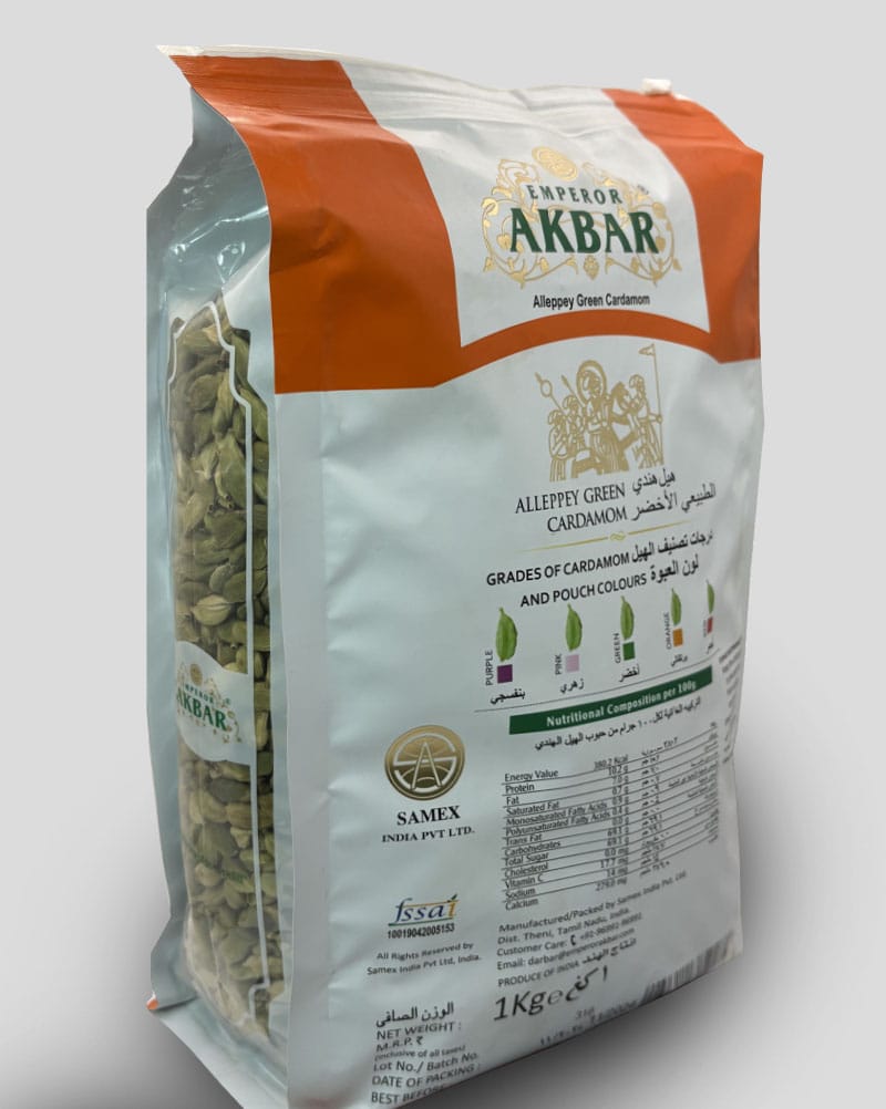هل اکبر بنفش ۱۰۰ گرمی، از مرغوبترین هلهای هندوستان است که با دانههای درشت، رنگ زیبا و عطر فراگیر خود، یکی از محبوبترین انواع هل در ایران شناخته میشود. هل اکبر بنفش بهدلیل کیفیت بالا و روغن فرار فراوان، طعمی گرم و دلانگیز به نوشیدنیها میبخشد و در میان علاقهمندان به عطر اصیل چای هندی جایگاه ویژهای دارد.